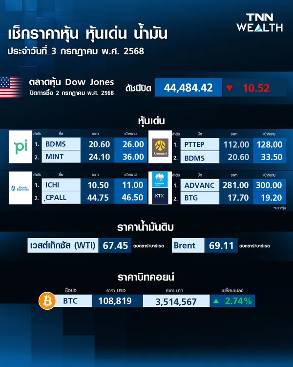 ราคาบิตคอยน์ วันนี้ (3 ก.ค.) ขยับขึ้น 2.74% ราคาอยู่ที่ 108,819 เหรียญสหรัฐ หรือราว 3,514,567 บาท ข้อมูลอัพเดต เมื่อเวลา 9.25 น.