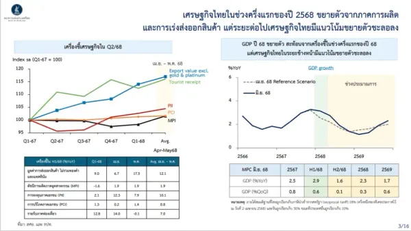 ธนาคารแห่งประเทศไทย (ธปท.) คาดว่าอัตราการขยายตัวทางเศรษฐกิจ (GDP) ของไทยในครึ่งปีหลังจะชะลอตัวลงเหลือเพียง 1.6% จากที่ครึ่งปีแรกขยายตัวได้ดี เนื่องจากได้รับผลกระทบจากมาตรการภาษีการค้าของสหรัฐ