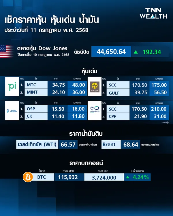ราคาบิตคอยน์วันนี้ (11 ก.ค. 68) ขยับขึ้น 4.24% ราคาอยู่ที่ 115,932 เหรียญสหรัฐ หรือราว 3,724,000 บาท ข้อมูลอัพเดต เมื่อเวลา 9.14 น. ที่ผ่านมา
