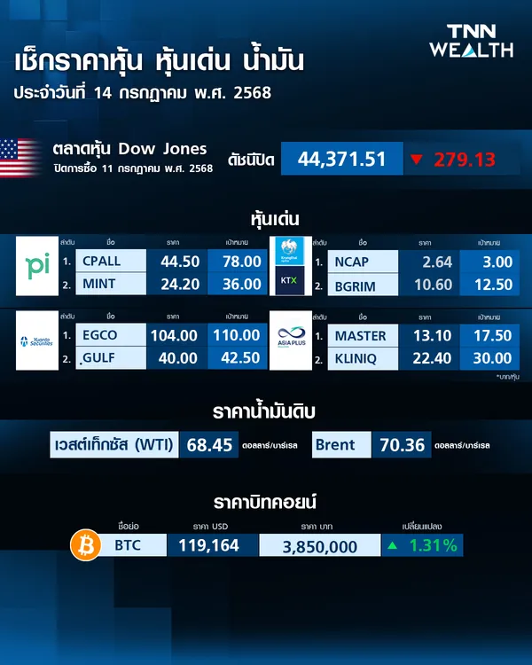 ราคาบิตคอยน์วันนี้ (14 ก.ค. 68) ขยับขึ้น 1.31% ราคาอยู่ที่ 119,164 เหรียญสหรัฐ หรือราว 3,850,000 บาท ข้อมูลอัพเดต เมื่อเวลา 9.15 น.