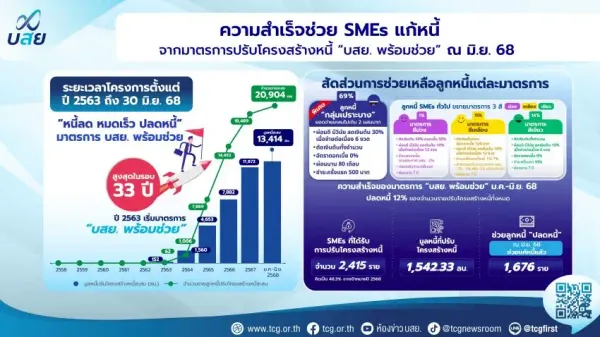 ขณะที่ในช่วงครึ่งปีแรกนี้ บสย. ประสบผลสำเร็จในการแก้หนี้ให้ลูกหนี้ที่ถูกจ่ายเคลม โดยตั้งแต่ออกมาตรการ "บสย. พร้อมช่วย" ในปี 2565 จนถึง 30 มิ.ย. 68 สามารถปรับโครงสร้างหนี้ได้ 20,904 ราย คิดเป็นมูลหนี้สะสมรวม 13,414 ล้านบาท และเฉพาะครึ่งแรกของปี 68 สามารถปรับโครงสร้างหนี้ได้ 2,415 ราย ในจำนวนนี้เป็น "กลุ่มเปราะบาง" ยอดจ่ายเคลมไม่เกิน 2 แสนบาท 1,676 ราย คิดเป็นมูลหนี้รวมกว่า 1,542 ล้านบาท และสามารถช่วยลูกหนี้ "ปลดหนี้" ปิดบัญชีได้สำเร็จ 12% ของจำนวนรายที่ปรับโครงสร้างหนี้ทั้งหมด