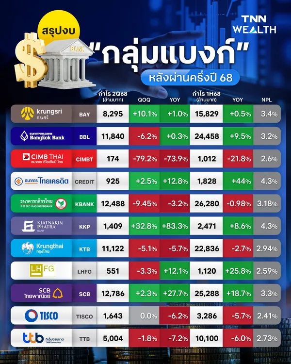 ธนาคารกรุงศรีอยุธยา จำกัด (มหาชน) หรือ BAY มีกำไรสุทธิในไตรมาส 2 ปี 2568 อยู่ที่ 8,295 ล้านบาท เพิ่มขึ้นจากไตรมาส 1 ปี 2568 อยู่ที่ 10.1% และปรับตัวเพิ่มขึ้นจากไตรมาส 2 ปี 2567 อยู่ที่ 1.0% และมีกำไรสุทธิรวมในช่วงครึ่งปีแรกของปี 2568 อยู่ที่ 15,829 ล้านบาท ปรับตัวเพิ่มขึ้นจากช่วงเดียวกันปีก่อนอยู่ที่ 0.5% รวมถึงมี NPL อยู่ที่ 3.4%
