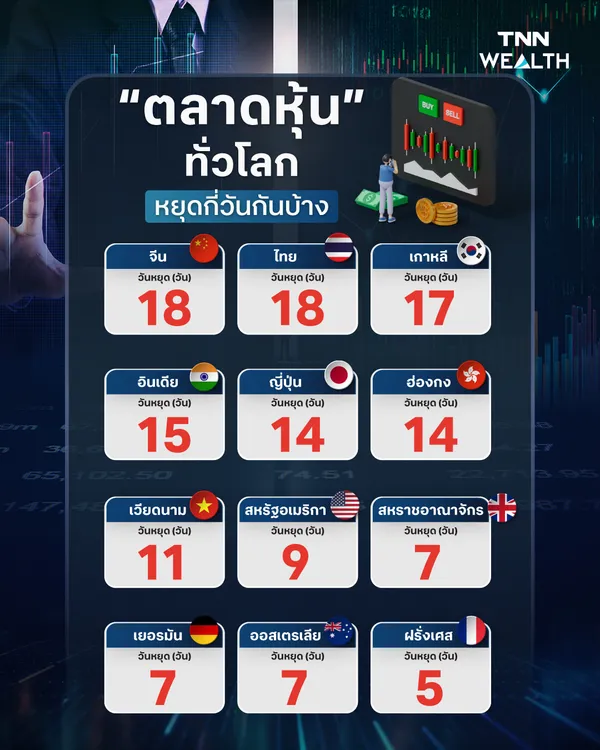จากการรวบรวมข้อมูลวันหยุดของตลาดหลักทรัพย์หลัก ๆ ทั่วโลกสำหรับปี 2025 จะพบว่า ตลาดหลักทรัพย์จีน และตลาดหลักทรัพย์แห่งประเทศไทยมีวันหยุดมากที่สุดที่ 18 วัน