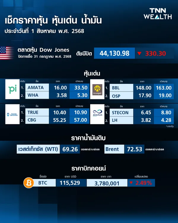 ราคาบิตคอยน์วันนี้ (1 ส.ค. 68) ปรับลง 2.49%