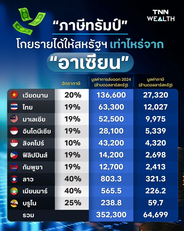 ซึ่งจากการประกาศอัตราภาษีของทางสหรัฐฯต่อทุกประเทศในอาเซียนที่แตกต่างกันไป และมีผลบังคับใช้เป็นที่เรียบร้อย สหรัฐฯจะสามารถสร้างรายได้จากภาษีได้สูงถึง 64,699 ล้านดอลลาร์สหรัฐ เมื่อเทียบกับมูลค่าการส่งออกสินค้าไปยังสหรัฐฯจากภูมิภาคอาเซียนในปี 2024 ซึ่งถ้าหากมูลค่าการส่งออกทั้งปีจากอเซียนไปยังสหรัฐฯ อยู๋ในระดับเดียวกับปี 2024 จะพบว่า
