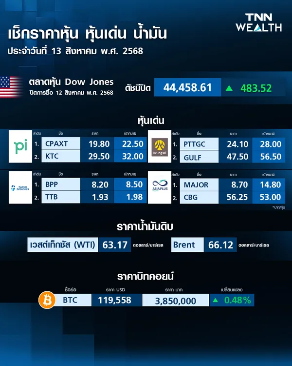 ราคาบิตคอยน์วันนี้ (13 ส.ค. 68) ขยับขึ้น 0.48%
