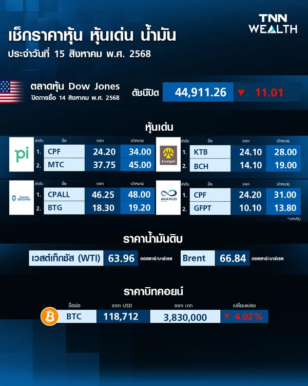 ราคาบิตคอยน์วันนี้ (15 ส.ค. 68) ปรับลง 4.02%