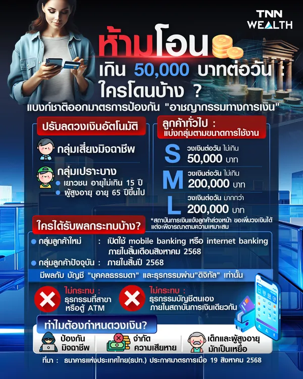 - "แบงก์ชาติ" ออกมาตรการใหม่ ห้ามโอนเงินเกิน 5 หมื่นบาทต่อวัน เน้นกลุ่มเปราะบาง หวังสกัดมิจฉาชีพหลอก