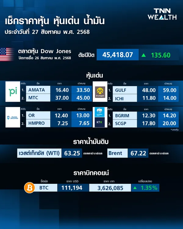 ราคาบิตคอยน์วันนี้ (27 ส.ค. 68) ขยับขึ้น 1.35%
