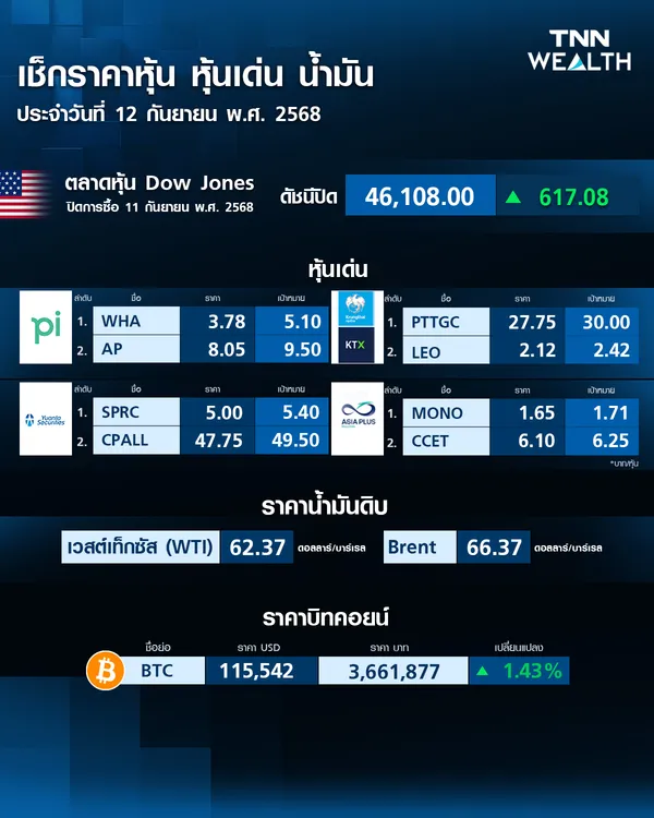 ราคาบิตคอยน์วันนี้ (12 ก.ย. 68) ขยับขึ้น 1.43% ราคาอยู่ที่ 115,542 เหรียญสหรัฐ หรือราว 3,661,87 บาท ข้อมูลเมื่อ 8.58 น.