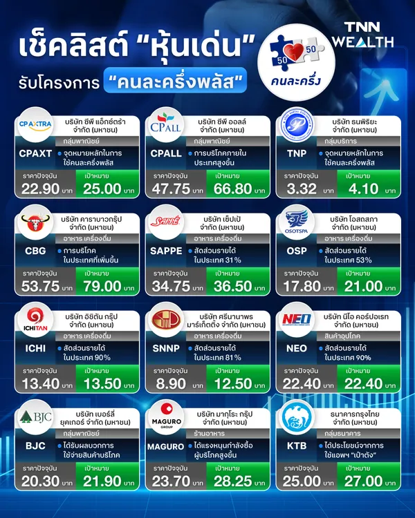 และประชาชนทั่วไปและผู้ถือบัตรสวัสดิการแห่งรัฐ จะได้รับสิทธิจ่ายคนละครึ่ง หรือรูปแบบ 50:50 โดยประชาชนจ่าย 50% และรัฐช่วยจ่ายอีก 50% โดยความเห็นนักวิเคราะห์บริษัทหลักทรัพย์ ดาโอ (ประเทศไทย) จำกัด (มหาชน) มีมุมมองเป็นบวกมากขึ้นจากกรอบระยะเวลาโครงการ “คนละครึ่งพลัส” ที่มีความชัดเจนมากขึ้น โดยหุ้นได้รับประโยชน์ ได้แก่