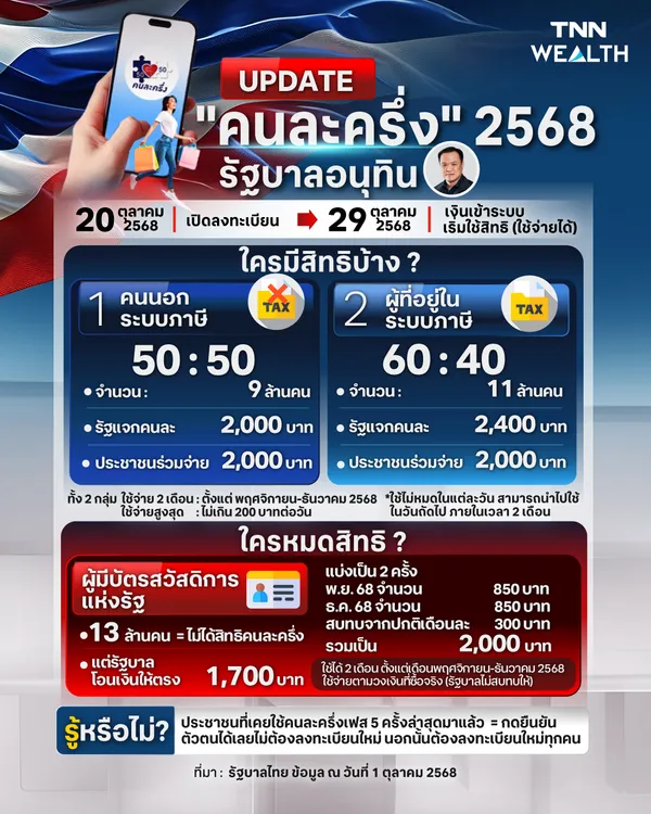 คืบหน้า โครงการ "คนละครึ่งพลัส" หรือ "คนละครึ่ง" 2568 ของรัฐบาลอนุทิน ล่าสุดวันนี้ 1 ตุลาคม 2568 ข้อมูลจาก "นายอนุทิน ชาญวีรกูล" นายกรัฐมนตรีและรัฐมนตรีว่าการกระทรวงมหาดไทย และ "นายเอกนิติ นิติทัณฑ์ประภาศ" รองนายกรัฐมนตรีและรัฐมนตรีว่าการกระทรวงการคลัง พร้อมด้วย "นายลวรณ แสงสนิท" ปลัดกระทรวงการคลัง ได้ออกมาเปิดเผยและสรุปได้ดังนี้