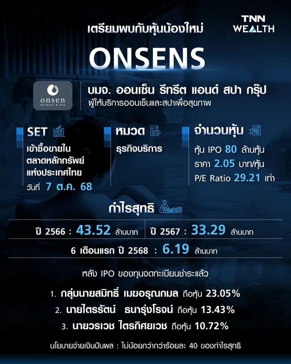 โดยใช้ชื่อย่อในการซื้อขายหลักทรัพย์ว่า “ONSENS” ในวันที่ 7 ตุลาคม 2568 เพื่อใช้ประโยชน์จากการระดมทุนในการขยายธุรกิจลงทุนในโครงการ Social Wellness Space ตอบรับนโยบายการท่องเที่ยวเชิงสุขภาพ (Wellness Tourism) ของภาครัฐเพื่อผลักดันให้ไทยเป็นศูนย์กลางสุขภาพและการท่องเที่ยวระดับโลก