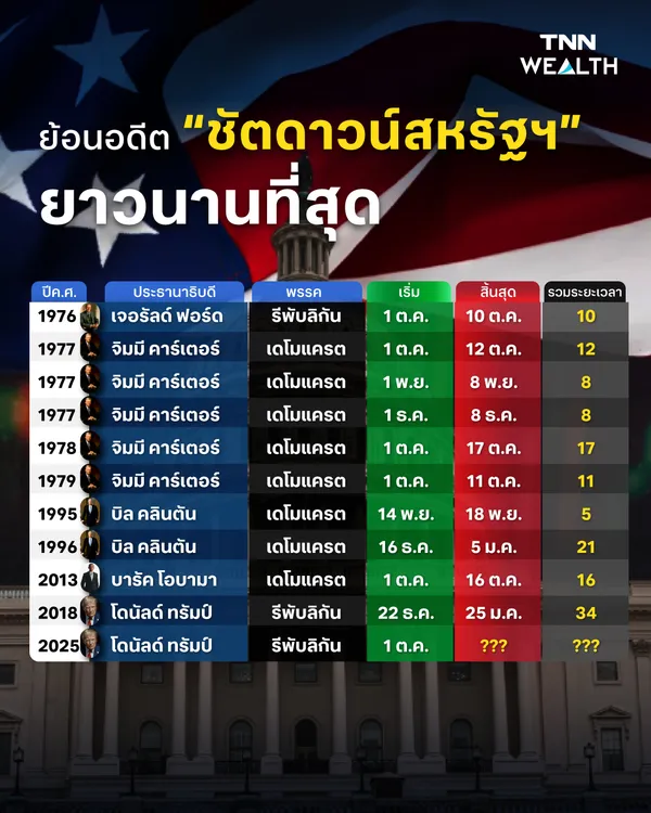 -ปีค.ศ.2025 ประธานาธิบดี โดนัลด์ ทรัมป์ พรรครีพับลิกัน เริ่มชัตดาวน์ 1 ต.ค. 2025 สิ้นสุด ??? รวมระยะเวลา ??? วัน