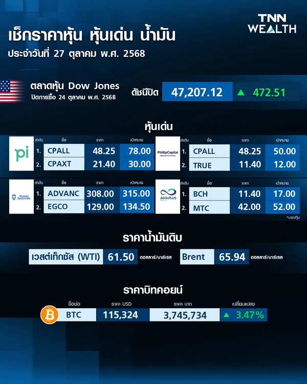 ราคาบิตคอยน์วันนี้ (27 ต.ค. 68) ขยับขึ้น 3.47%