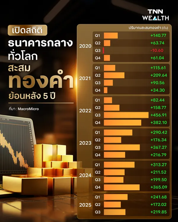 ปี 2025 ในช่วง Q1 มีการสะสมทองคำเพิ่มขึ้น 241.68 ตัน Q2 มีการสะสมทองคำเพิ่มขึ้น 172.02 ตัน และ Q3 สะสมทองเพิ่มขึ้น 219.85 ตัน