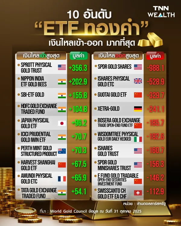 1.SPDR Gold Shares จดทะเบียนจัดตั้งในสหรัฐอเมริกา มีเงินไหลออก 988.1 ล้านดอลลาร์สหรัฐฯ