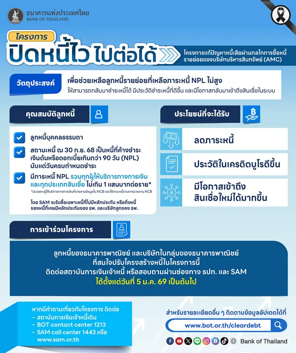ทั้งนี้ หากลูกหนี้มีคุณสมบัติตามเงื่อนไขโครงการแต่ไม่ได้รับจดหมายดังกล่าว และมีความประสงค์เข้าร่วมโครงการ สามารถติดต่อสถาบันการเงินเจ้าหนี้ หรือสอบถามผ่านช่องทาง ธปท. หรือ SAM ได้ตั้งแต่วันที่ 5 ม.ค. 2569 เป็นต้นไป ซึ่ง SAM (หรือคนที่ SAM มอบหมาย) จะติดต่อกลับหากลูกหนี้มีสิทธิ์ตามเงื่อนไข