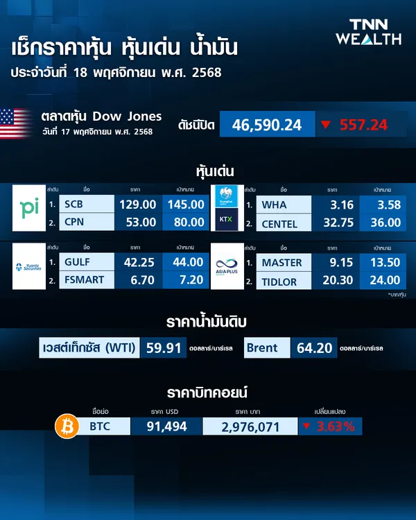 ราคาบิตคอยน์ประจำวันนี้ (18 พ.ย. 68) ปรับลง -3.63%
