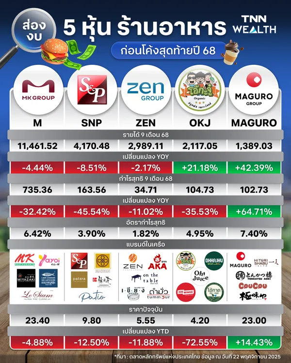 ในตลาดหลักทรัพย์แห่งประเทศไทยก็เช่นเดียวกัน มีบริษัทจดทะเบียนที่ดำเนินธุรกิจแบรนด์ร้านอาหารอยู่ด้วย ซึ่งมีทั้งแบรนด์ที่มีอายุหลายสิบปี ไปจนถึงแบรนด์ร้นอาหารเกิดใหม่ที่ประสบความสำเร็จอย่างรวดเร็ว โดยผลการดำเนินงานของ 5 บริษัทที่ทำธุรกิจอาหารใในตลาดหลักทรัพย์แห่งประเทศไทย มีดังนี้