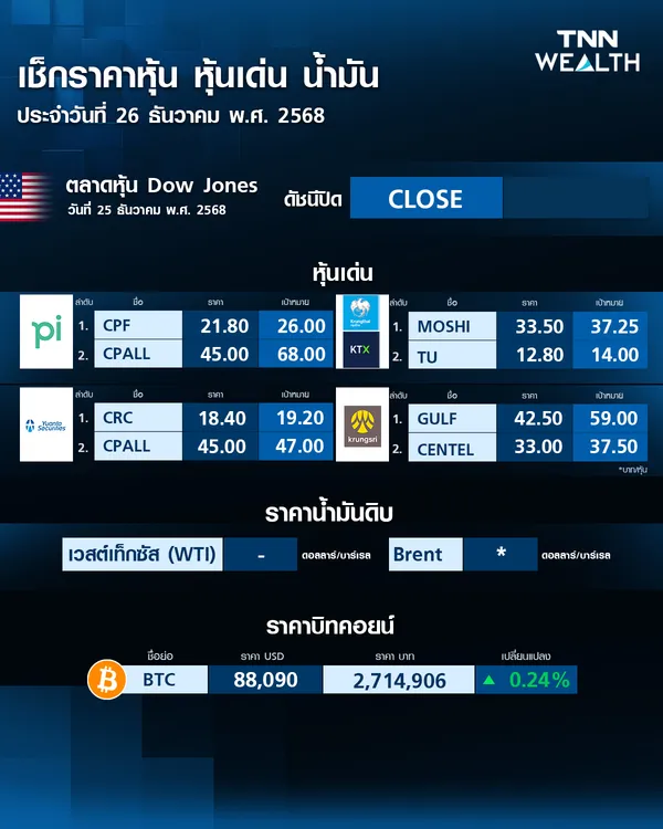 ราคาบิตคอยน์วันนี้ (26 ธ.ค. 68) ปรับขึ้น 0.24% ราคา