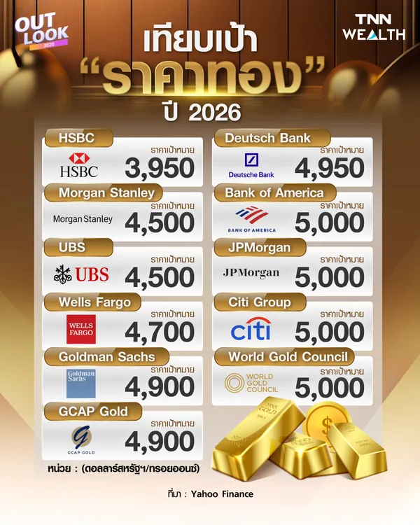 ปัจจัยต่าง ๆ ที่ยังคงสนับสนุนราคาทองคำ ส่งผลให้เกิดการคาดการณ์ราคาทองคำจาดสถาบันทางการเงินทั่วโลก ซึ่งส่วนใหญ่ก็ยังมีมุมมองที่เป็นบวกต่อราคาทองคำในปี 2026 แต่ราคาทองคำก็อาจจะไม่ได้เคลื่อนไหวอย่างร้อนแรงเหมือนกับในปี 2025 ที่ผ่านมา โดยสถาบันการเงินทั่วโลกได้คาดการณ์เป้าหมายราคาทองคำในปี 2026 ดังนี้