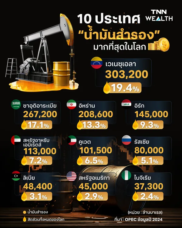 1.เวเนซุเอลา มีน้ำมันสำรอง 303,200 ล้านบาเรล คิดเป็นสัดส่วน 19.4% ของน้ำมันสำรองทั้งหมดของโลก
