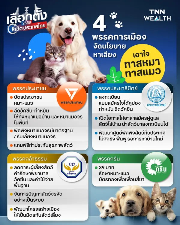 การเลือกตั้งทั่วไปปี 2569 นอกจากประเด็นเศรษฐกิจและสวัสดิการคนแล้ว พรรคการเมืองยังเริ่ม ชูนโยบายเกี่ยวกับสวัสดิภาพสัตว์เลี้ยงอย่าง “หมา–แมว” เพื่อดึงคะแนนกลุ่มผู้เลี้ยงสัตว์ทั่วประเทศ ซึ่งมีทั้งแนวทางสร้างระบบดูแลสัตว์อย่างเป็นระบบและลดภาระค่าใช้จ่ายให้เจ้าของสัตว์เลี้ยง.