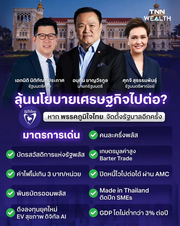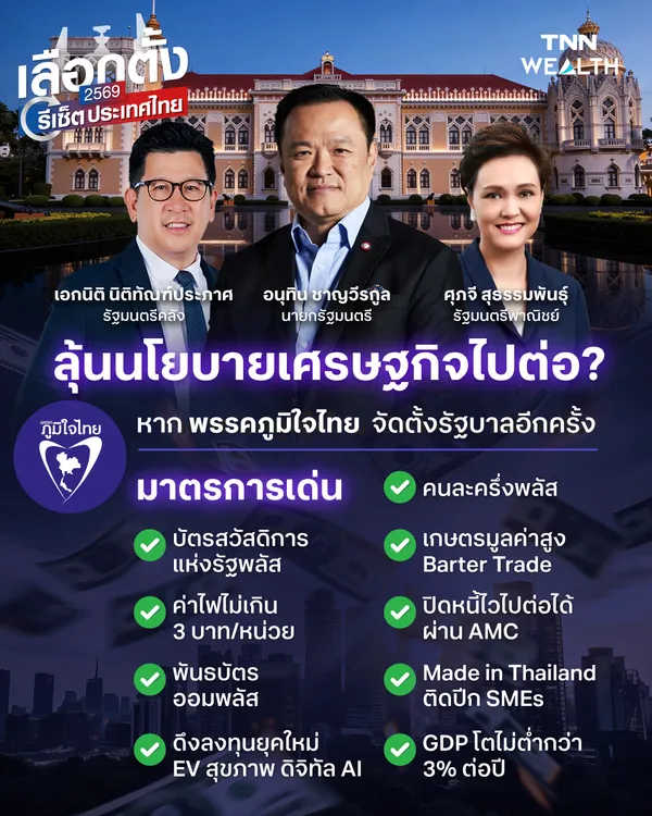 TNN WEALTH พามาย้อนดูกรอบนโยบายเศรษฐกิจของรัฐบาลภูมิใจไทยที่คาดว่าจะทำต่อไปหากเป็นรัฐบาล มาตรการเด่นๆ ทั้งหมดอยู่ภายใต้แนวคิด “เศรษฐกิจ 10 Plus” และเป้าหมายการขยายตัวทางเศรษฐกิจหรือ GDP ไม่ต่ำกว่าร้อยละ 3 ต่อปี โดยเน้นการประคองกำลังซื้อประชาชนในระยะสั้น ควบคู่กับการปรับโครงสร้างเศรษฐกิจในระยะกลางและยาว ผ่านมาตรการด้านรายได้ การลงทุน และการลดต้นทุนของภาคธุรกิจ