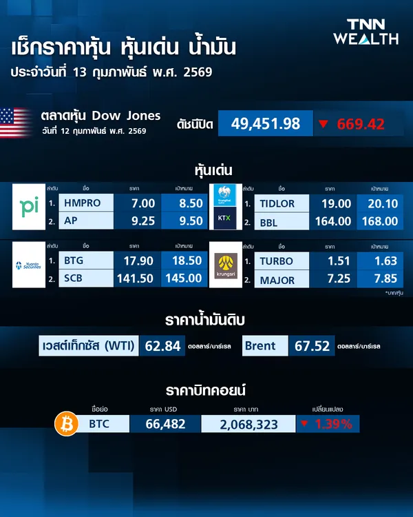 ราคาบิตคอยน์วันนี้ (13 ก.พ. 69) ปรับลง -1.39%