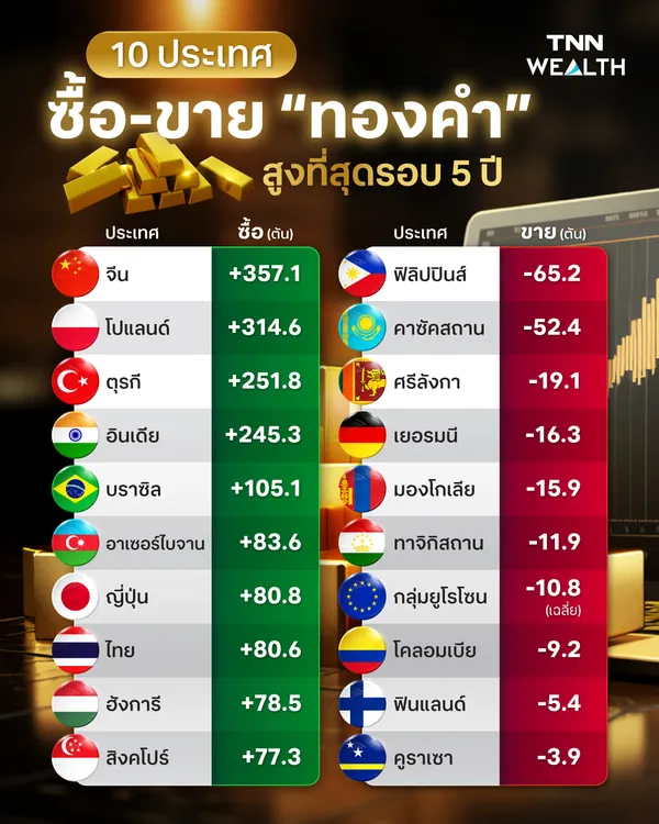 สภาทองคำโลก หรือ World Gold Council ออกรายงานความเคลื่อนไหวในการถือครองทองคำของประเทศต่าง ๆ ทั่วโลกในรอบ 5 ปีืี่ผ่านมา (2020-2025) โดยรายงานการซื้อขายทองคำสุทธิของประเทศต่าง ๆ