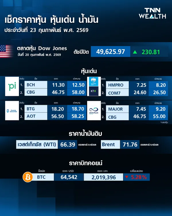 ราคาบิตคอยน์ประจำวันนี้ (23 ก.พ. 69) ปรับลง -5.28% มาอยู่ที่ 64,542 เหรียญสหรัฐ หรือราว 2,019,396 บาท ข้อมูลเวลา 9.01 น.