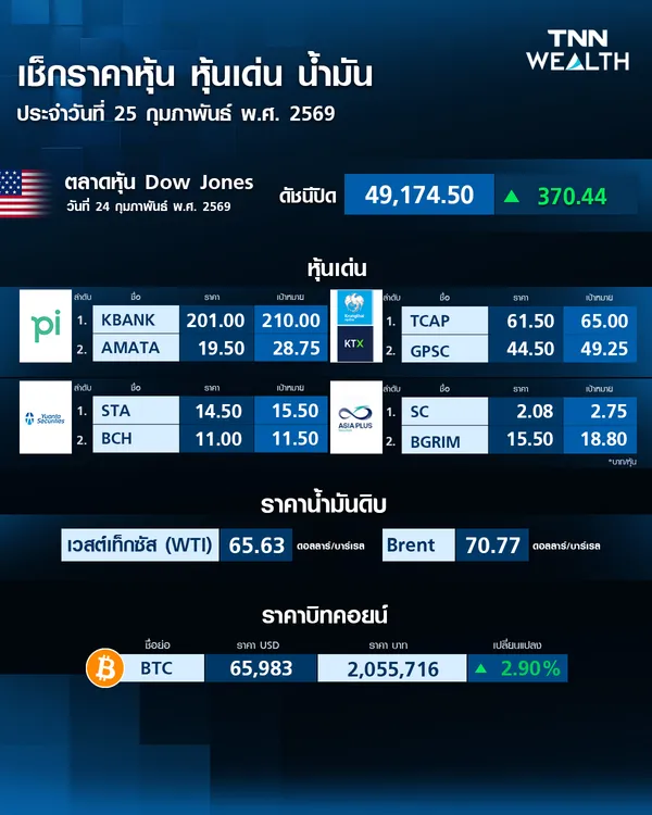 ราคาบิตคอยน์วันนี้ (25 ก.พ. 69) ปรับขึ้น 2.90%