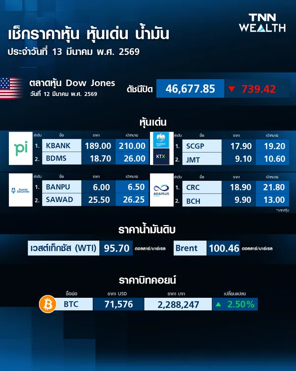 ราคาบิตคอยน์วันนี้ (13 มี.ค. 69) ขยับขึ้น 2.50%
