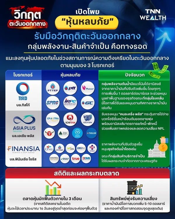 เปิดโพย “หุ้นหลบภัย” รับมือวิกฤติตะวันออกกลาง หลังความตึงเครียดดันราคาน้ำมันและทองคำพุ่ง นักวิเคราะห์ 3 โบรกเกอร์ แนะปรับพอร์ตสู่ กลุ่มพลังงาน–สินค้าโภคภัณฑ์ ที่ได้อานิสงส์จากราคาพลังงานขาขึ้น