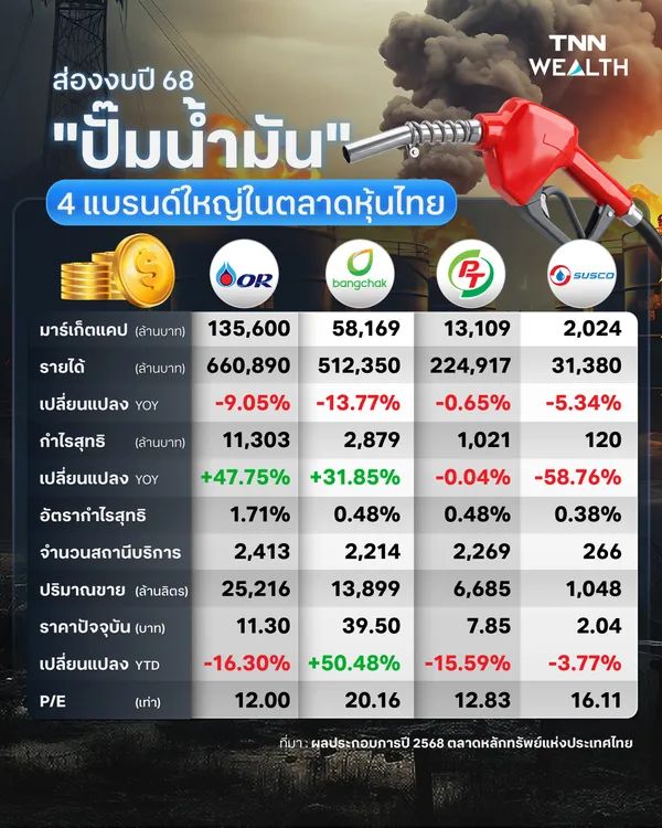 แล้วผลการดำเนินงานของปี 2568 ของสถานีบริการ 4 แบรนด์ใหญ่ที่อยู่ในตลาดหลักทรัพย์แห่งประเทศไทย ประกอบไปด้วย OR, BCP, PTG และ SUSCO เป็นอย่างไรกันบ้าง