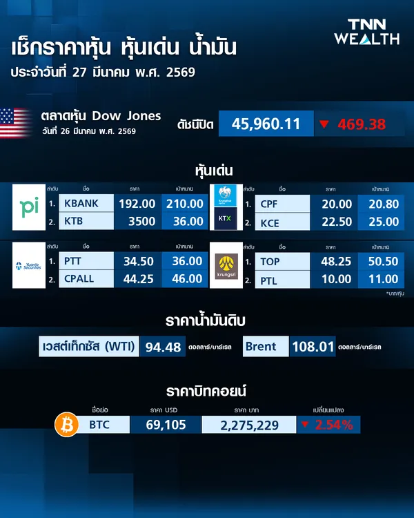 ราคาบิตคอยน์วันนี้ (27 มี.ค. 69) ปรับลง -2.54%
