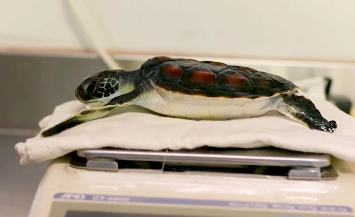 ซาราห์ เมล พยาบาลสัตว์ของสวนสัตว์ทารองกา ซู เผยผ่านคลิปวิดีโอที่โพสต์ผ่านทวิตเตอร์ของสวนสัตว์ว่า เจ้าหน้าที่สวนสัตว์ช่วยชีวิตเต่าเพศผู้ น้ำหนักตัว 128 กรัม ซึ่งเสียครีบหลังไปข้างหนึ่ง ได้ที่หาดใกล้สวนสัตว์