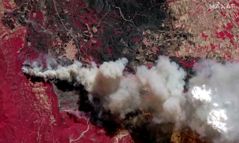 เปิดภาพถ่ายดาวเทียม เป็นภาพนักดับเพลิงกำลังต่อสู้กับไฟป่าท่ามกลางกลุ่มควันขนาดใหญ่ในทางตอนเหนือของกรีซ