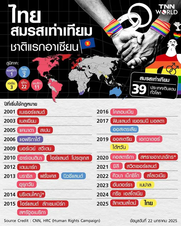 ปัจจุบันมีประเทศและดินแดน ที่มีกฎหมายสมรสเท่าเทียมแล้ว 39 ประเทศ/ดินแดนทั่วโลก โดยไทยเป็นแห่งที่ 3 ของเอเชีย และเป็นแห่งแรกในอาเซียน