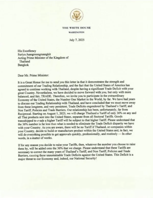 เนื้อหาในจดหมายที่มีความยาวประมาณ 1 หน้าครึ่ง มีเนื้อหาใจความโดยสรุปว่า “สหรัฐฯ ยังคงอยากทำการค้ากับประเทศไทย แม้ว่าสหรัฐฯ จะขาดดุลการค้ากับประเทศไทยเป็นเงินจำนวนมาก แต่สหรัฐฯ จะขอทำการค้ากับไทยให้เป็นธรรมและมีความสมดุลมากกว่านี้ ดังนั้น นับตั้งแต่วันที่ 1 สิงหาคม ปี 2025 เป็นต้นไป สหรัฐฯ จะเก็บภาษีสินค้านำเข้าจากประเทศไทยทุกประเภท ในอัตรา 36% ซึ่งทางสหรัฐฯ อธิบายว่าอัตรา 36% ที่สหรัฐฯ เรียกเก็บยังถือว่าเป็นอัตราที่ต่ำ หากพิจารณาจากการขาดดุลการค้าที่สหรัฐฯ มีต่อประเทศไทย พร้อมกับแนะนำว่าหากบริษัทไหนในประเทศไทยที่อยากจะส่งสินค้ามาขายในสหรัฐฯ และไม่อยากถูกเรียกเก็บภาษีก็สามารถย้ายฐานการผลิตมาตั้งโรงงานในสหรัฐฯ ได้ และหากประเทศไทยตอบโต้สหรัฐฯ ด้วยการขึ้นภาษี ทางสหรัฐฯ ก็จะขึ้นภาษีตอบโต้กลับในอัตราที่เท่ากัน”