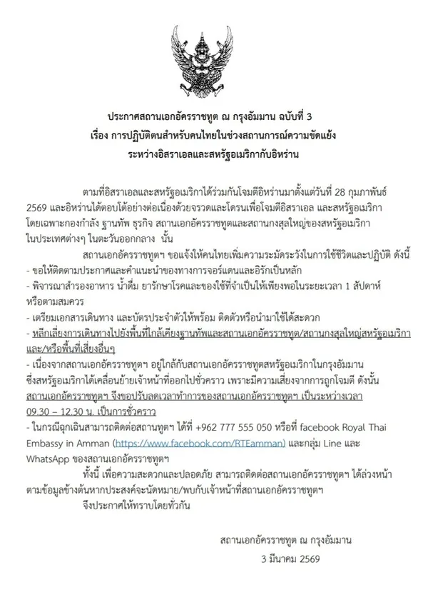 ประกาศสถานเอกอัครราชทูต ณ กรุงอัมมาน ฉบับที่ 3 เรื่อง การปฏิบัติตนสำหรับคนไทยในช่วงสถานการณ์ความขัดแย้งระหว่างอิสราเอลและสหรัฐอเมริกากับอิหร่าน