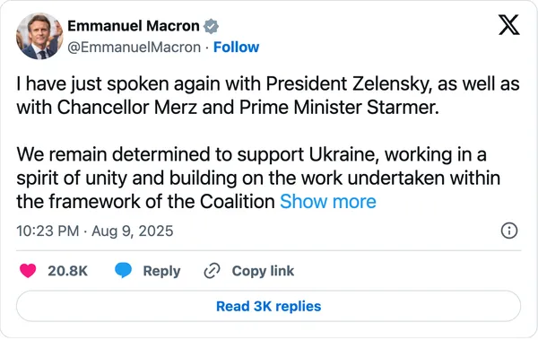 มาครงเผยว่า ก่อนหน้านี้ได้คุยทางโทรศัพท์กับประธานาธิบดีเซเลนสกี, นายกรัฐมนตรีฟรีดริช แมร์ซ ของเยอรมนนี และนายกรัฐมนตรีเคียร์ สตาร์เมอร์ ของอังกฤษ และทุกฝ่ายพร้อมที่จะทำงานร่วมกันอย่างสร้างสรรคในการนำมาซึ่งสันนติภาพที่แท้จริง